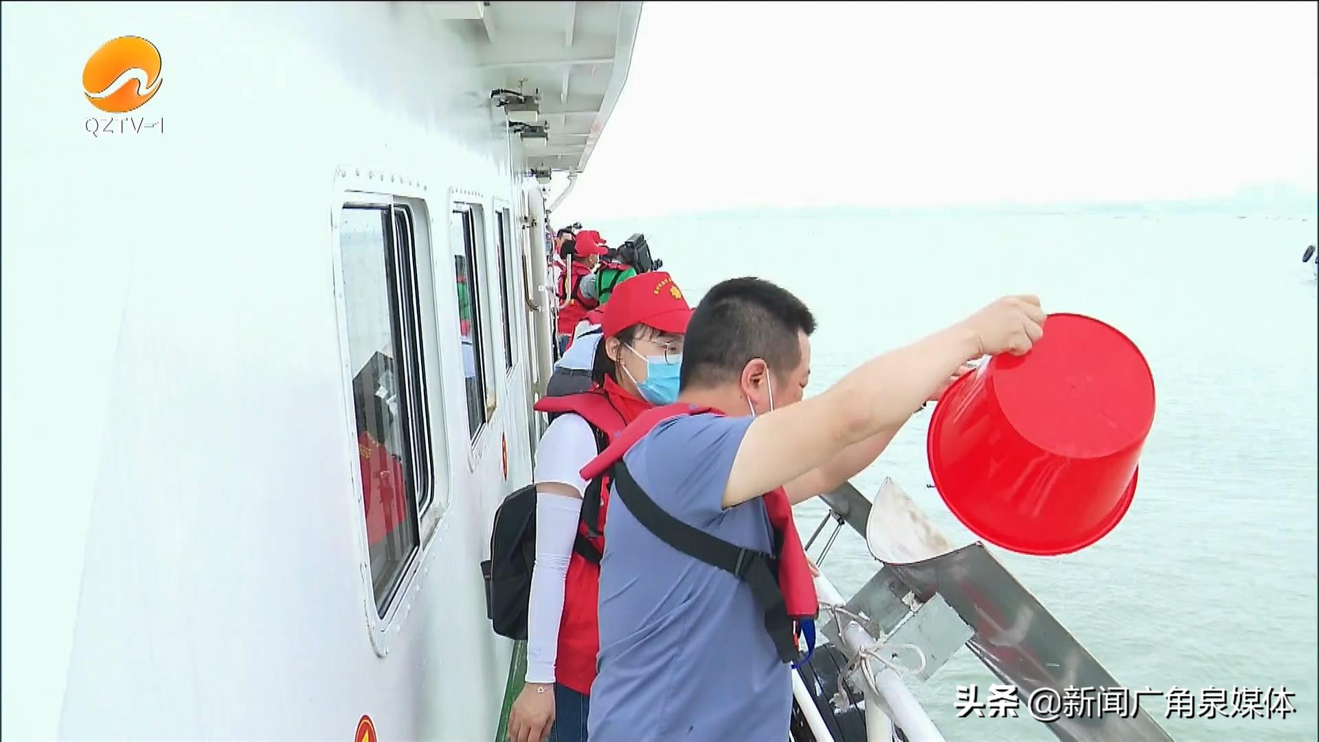 上午九时许,市领导和市直部门相关负责人、海洋环保志愿者一行登上中国渔政35301船,驶向泉州湾湾外海域。船上数口大桶中,黑鲷、真鲷鱼苗活蹦乱跳。上午十时许,放流活动正式开始,大家将鱼苗倒入船舷外侧临时安装的导流槽,鱼儿们顺着导流槽飞奔而下,欢快地游向大海。
